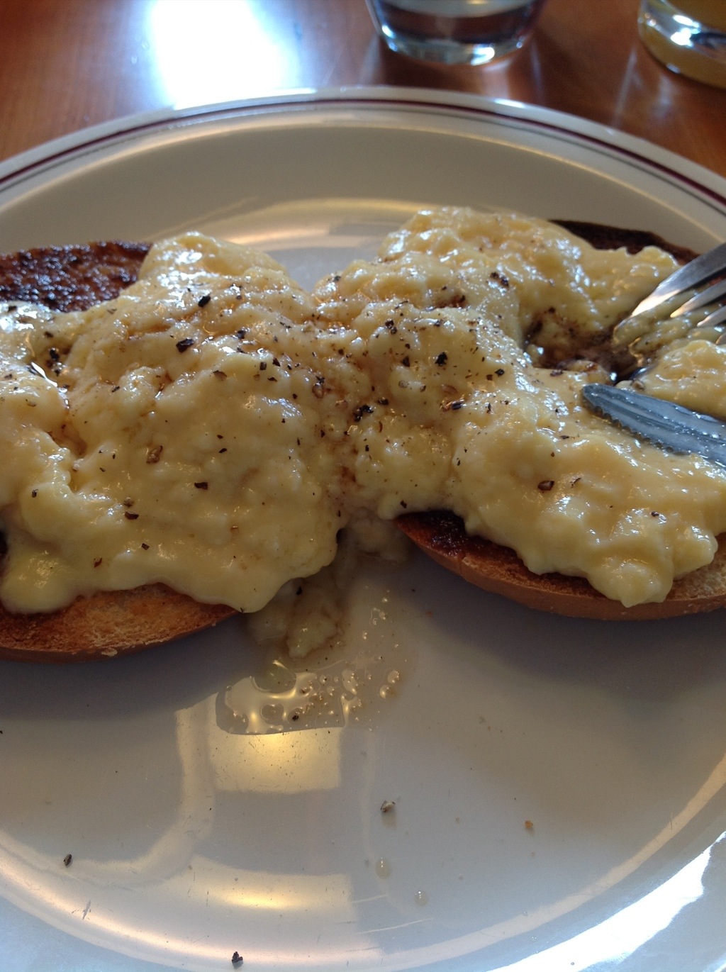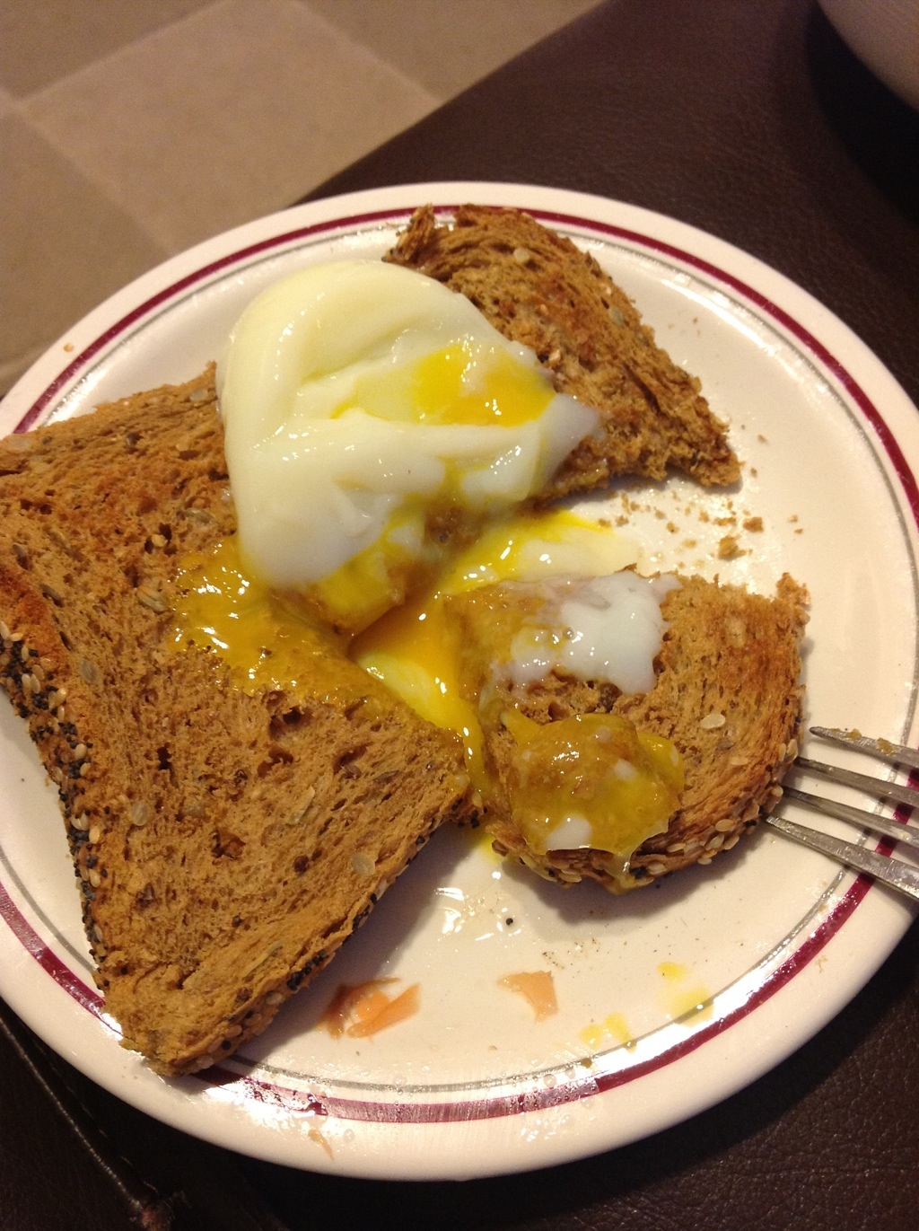 One of Hestons recipes, this was a very easy breakfast. Because its all cooked in a disposable bag, there’s no washing up – just break the eggs, milk, cream and seasoning into a bag, moosh it around and cook for 15 minutes before pouring onto a plate. Simple! The texture is very smooth, almost custardy.