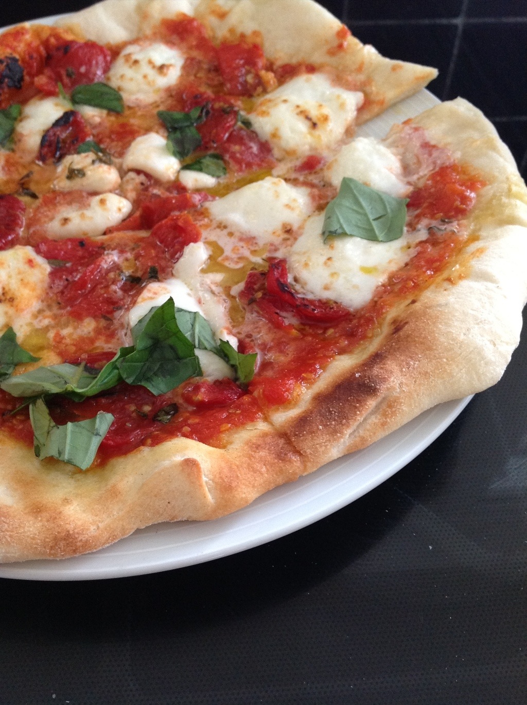 The real magic is the way it’s cooked. Heating a large iron/carbon steel frying pan over a hob over a very high heat for at least 15 minutes means it’s smoking hot. You then flip it over and place it under a grill, also set to high, as close to the element as possible. Leaving it for another few minutes reaches a peak temperature far hotter than a domestic oven. Carefully sliding the pizza inbetween cooks it in around 90-120 seconds and results in a beautifully light puffy crust with a gentle char. Perfect.