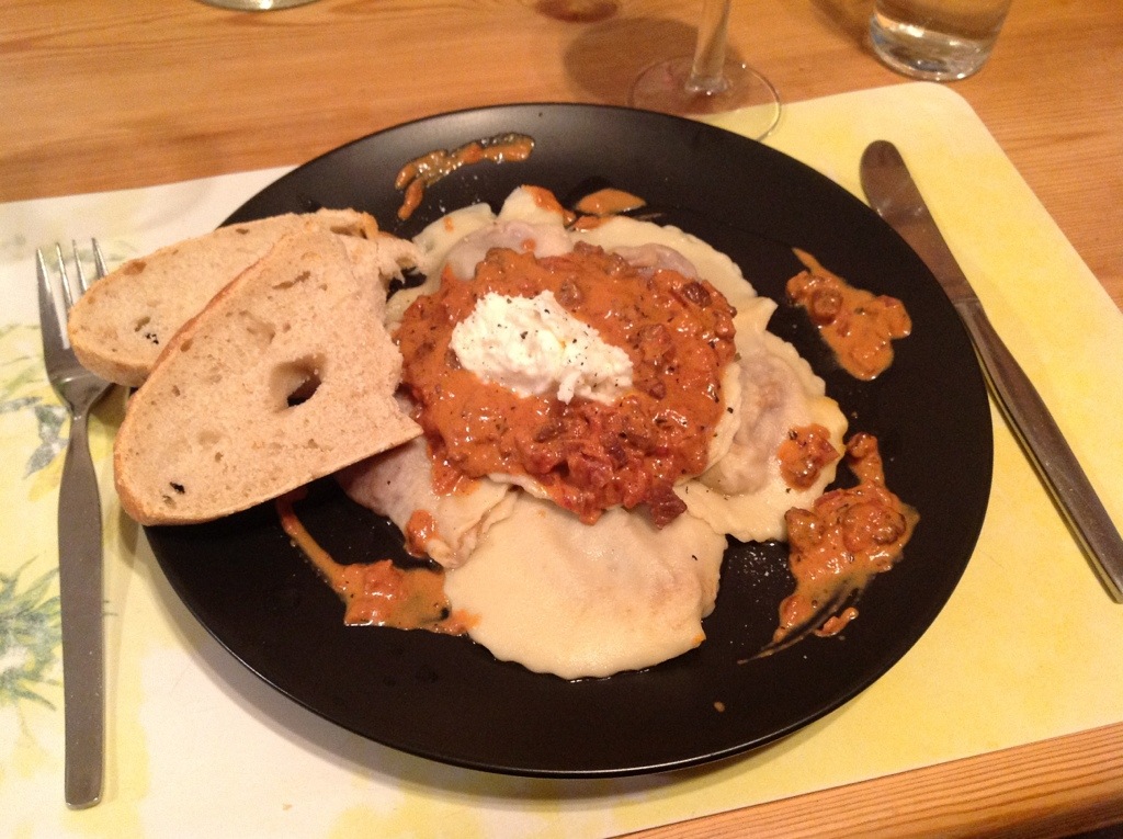 Home-made pasta is great – its a fantastic way of showing off a simple flavour combination and beef, red wine and mozzarella is about as Italian as it gets. Yum.