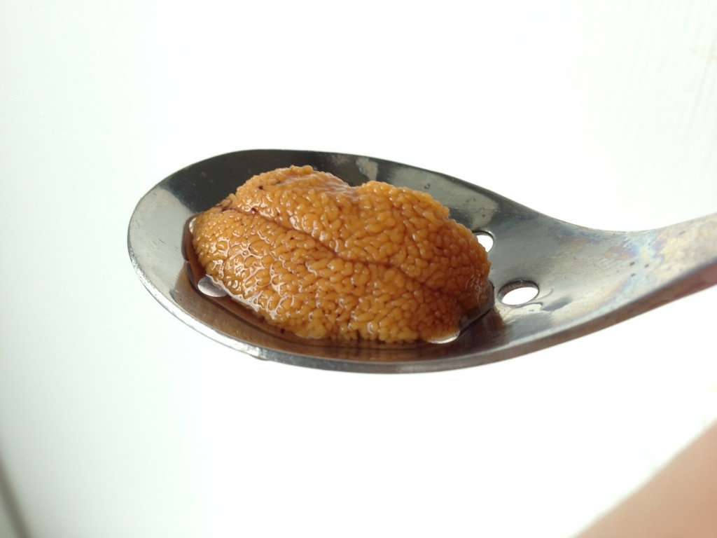 I’ve been dying to try these ever since they were featured on Masterchef: The Professionals. Watching seasoned restaurant chefs completely wreck an ingredient was fantastic entertainment. Challenge accepted! The fishmonger at Pimlico’s Tachbrook Street Market is brilliant and had a crate of them nestled alongside his oysters. I’m not going to lie – they’re pretty intimidating up close! I hadn’t appreciated that the spines move, having carefully posed them in the kitchen I came back to find them making a bid for freedom. As Monica showed on Masterchef, you dispatch them by using the heel of a knife to break a circle in the shell around the mouth and pulling out their ‘core’. I like to think I have a pretty strong stomach – I can happily gut fish, shell crabs, bone trotters and play with offal, but this really takes the biscuit. Once it’s discarded you’re left with some ‘juice’ at the bottom of the shell which should be sieved and saved, and the all-important corals. These slightly orange-coloured segments need to be carefully extracted with a small spoon, carefully avoiding the inedible black sections. The corals are very fragile so it’s easy to squash them, especially with smaller urchins.
