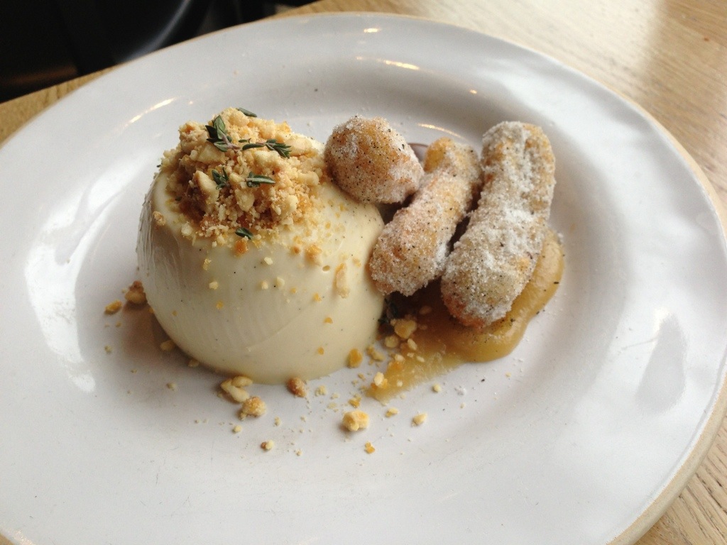 For dessert I had a Calvados Panna Cotta. This is damn near a perfect pudding. It’s got different temperatures, textures and flavours that all blend together beautifully. The panna cotta is actually more of a mousse, but really delicious. The dusting of crumble adds some welcome crunch and the warm doughnuts are crisp and gooey. Heaven on a plate.