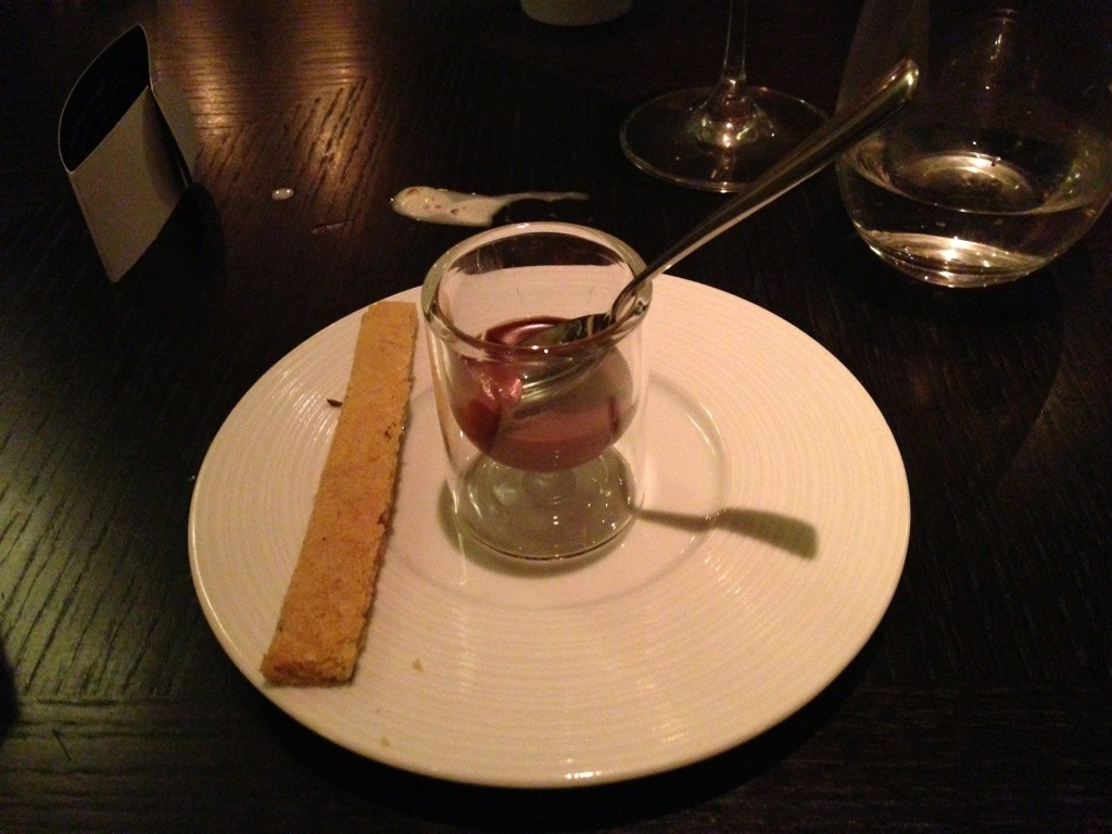 We were brought this little extra dessert with coffee – a morsel of lovely light chocolate ganache with fragrant, floral biscuit.
