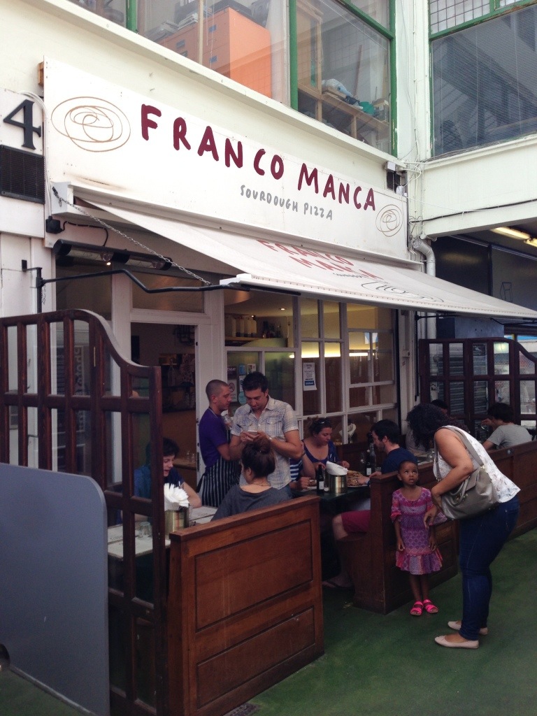 Franco Manca is at the forefront of this movement, their Brixton market location is spread across two units. I can understand the need to keep tables free, but sitting single diners with other groups when there are empty tables seems a little mean. Their menu is simple and uncomplicated – a handful of pizzas and some interesting wines. I ordered their organic house red, an unusual italian wine which showcases strong mineral flavours rather than fruit, it was delicious!