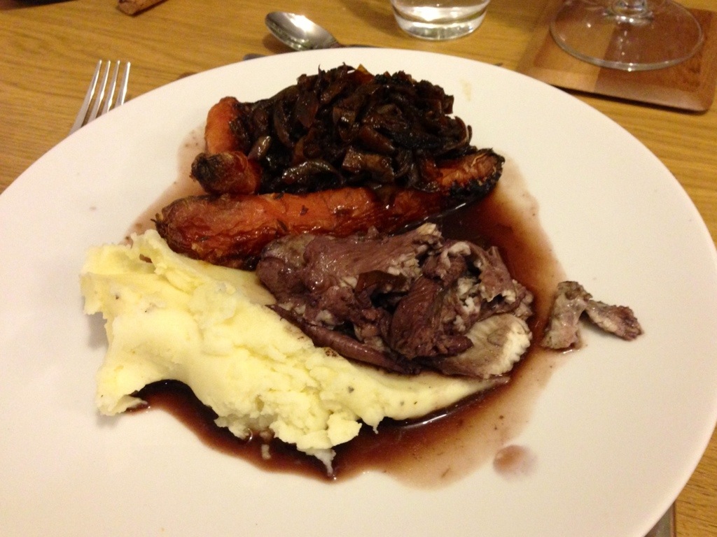 I’m a huge fan of fish in red wine – I normally do turbot, but plaice is much better value! With this recipe you cook the onions for around eight hours to bring out the sweetness and the result is a really intense, slightly smokey onion hit. Back it all up with a lovely balsamic and red wine sauce (with some cheeky marmite thrown in) and you’ve got something really special. I added some mashed potato, but it really didn’t need it. Though they’re not shown, I did make the onion ring garnish too – they add some great textural contrast.