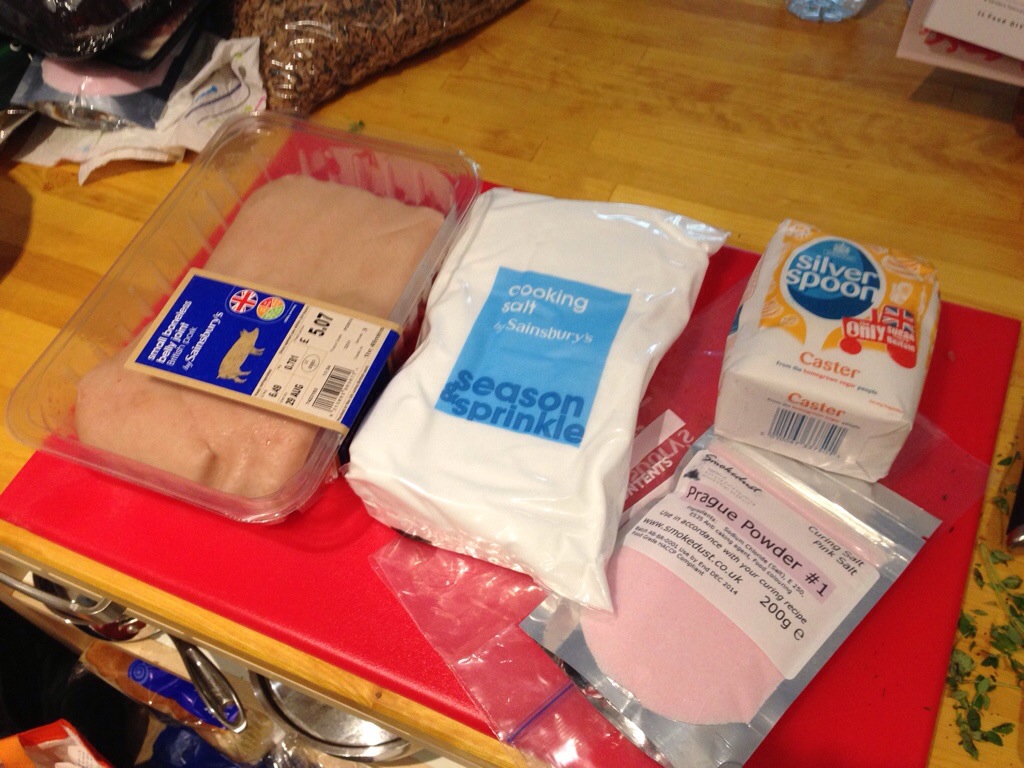Who doesn’t like bacon!? But how many of us actually know how it’s made – a quick straw poll of friends indicated that it was “to do with salt” or “sort of dried”. They’re both actually right – people have been preserving meat for years and this is one of the simplest ways. Grab a piece of pork and stick it in some sugar and salt, then let it sit for about a week et voila. Now admittedly this will make it turn a slightly gray colour – getting that lovely pink requires proper curing salts which contain sodium nitrite, but these are easily available from sausage and charcuterie shops online, a friendly butcher may even let you have some.