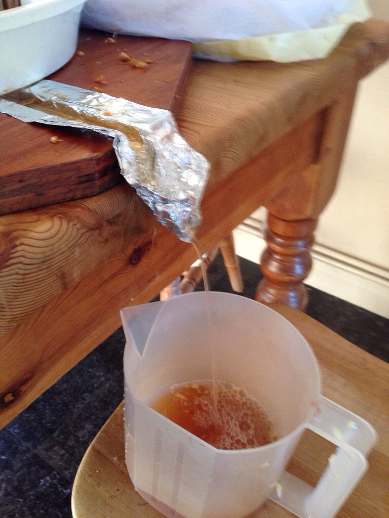 Next up is juice extraction – you can use a centrifugal juicer or if you’re lucky enough to have a fruit press, it creates a more authentic result. I find the press gives much clearer juice with less bits and a cleaner flavour. It’s worth checking the sugar content with a hydrometer – this is a natty little gadget that looks like a thermometer, but floats at different heights in the liquid depending on the density. If there isn’t enough sugar for the yeast to work on then the cider will be too sweet and won’t have enough alcohol to preserve it. There are plenty of websites to help you convert the reading into an alcohol by volume. I always aim for about 6-7%ABV. If it’s too low you can top it up with some caster sugar or just add a sweeter variety of apple juice.