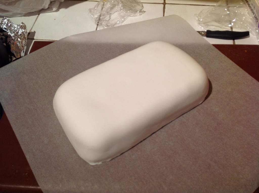 Brush some clear alcohol over the marzipan covered cake to create an adhesive. Roll out the ivory sugar paste and place it over the marzipan in the same way. Trim away any excess as before, reserving the trimmings for covering the cake board. Leave to set overnight.