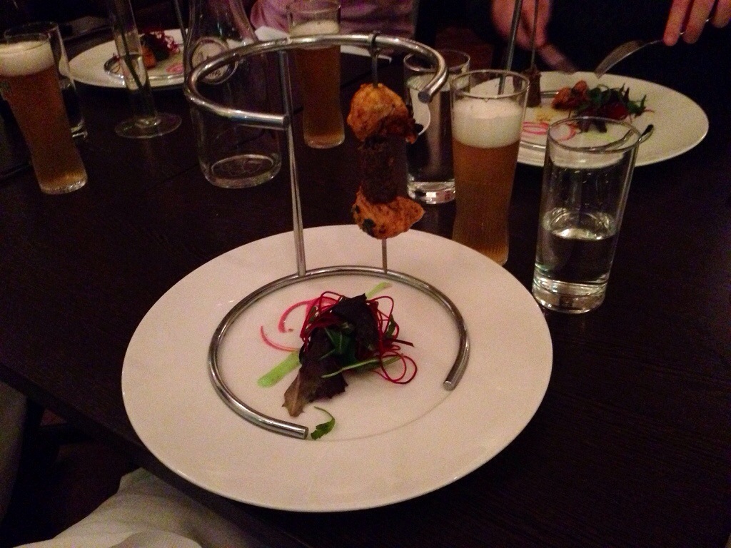 A wonderful selection of little bites started the meal, all beautifully presented. Apple and raw fish is a good combo, but the star was the little deep fried brawn cubes – crispy, warm and deeply piggy. The bread was also excellent: sourdough, bacon brioche and a crystallised malt – freshly made in house.